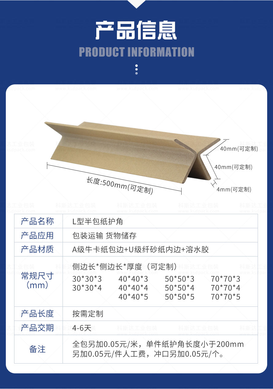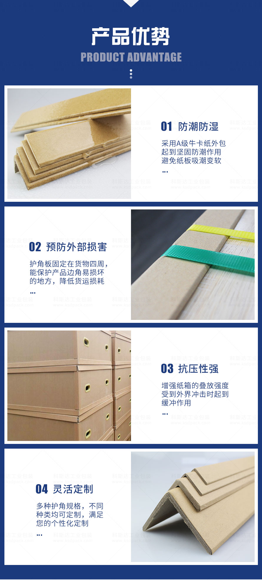[產(chǎn)品介紹]廣東科斯達(dá)工業(yè)包裝提供高硬度、防潮防水的L型紙護(hù)角,采用牛皮紙多層擠壓成型,替代木方護(hù)角,保護(hù)貨物邊緣,抗壓防撞。