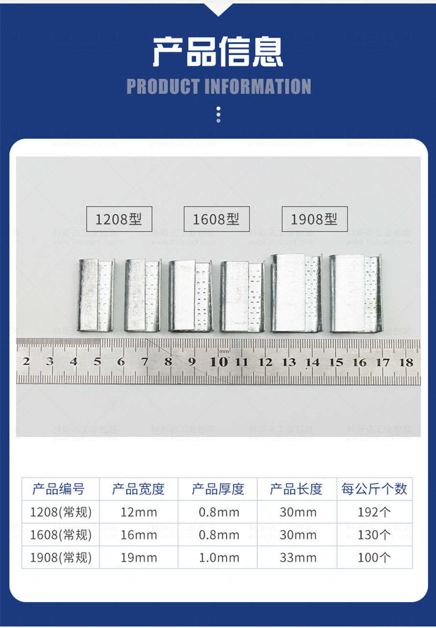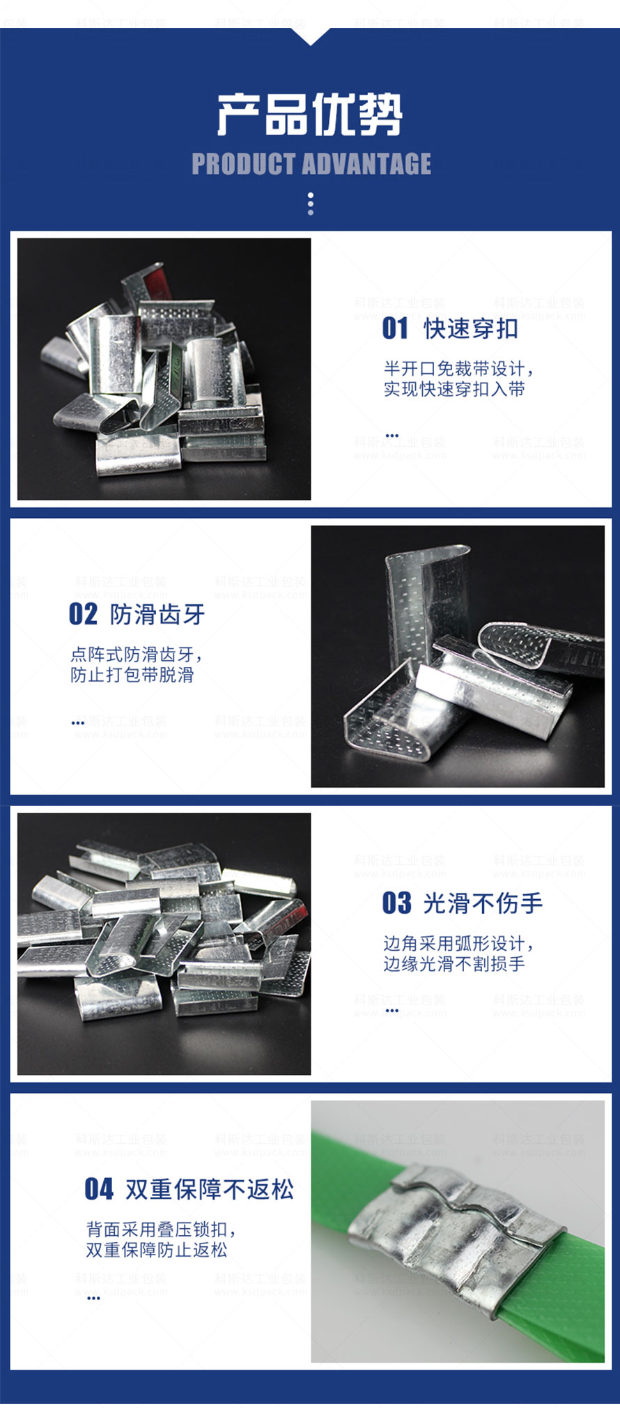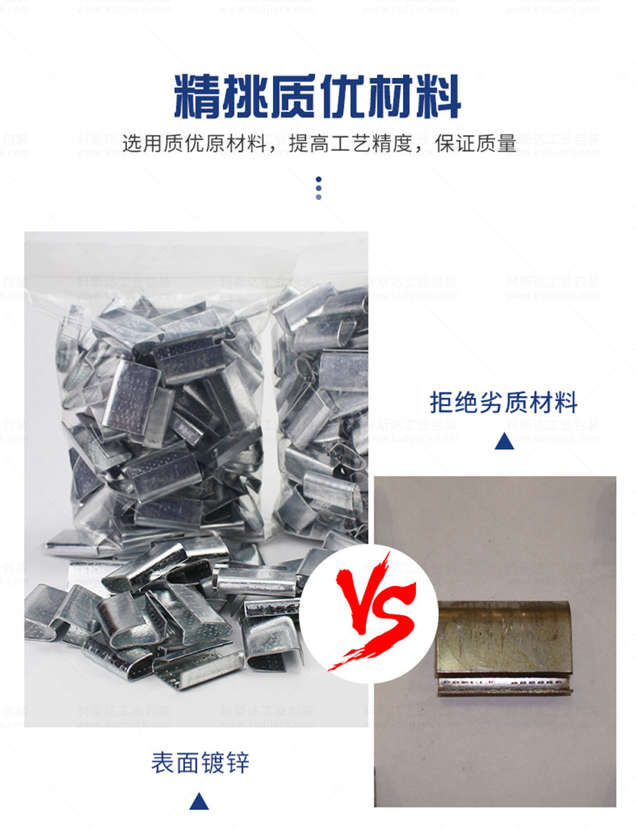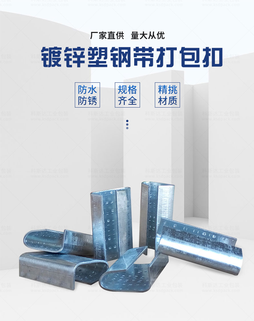 [產(chǎn)品介紹]科斯達工業(yè)包裝提供的塑鋼帶打包扣選用寶武集團的鍍鋅鋼材沖壓而成打包扣,配套12/16/19mm寬度塑鋼帶捆扎,內(nèi)有齒牙不脫滑,鍍鋅鋼材不生銹,歡迎咨詢選購。