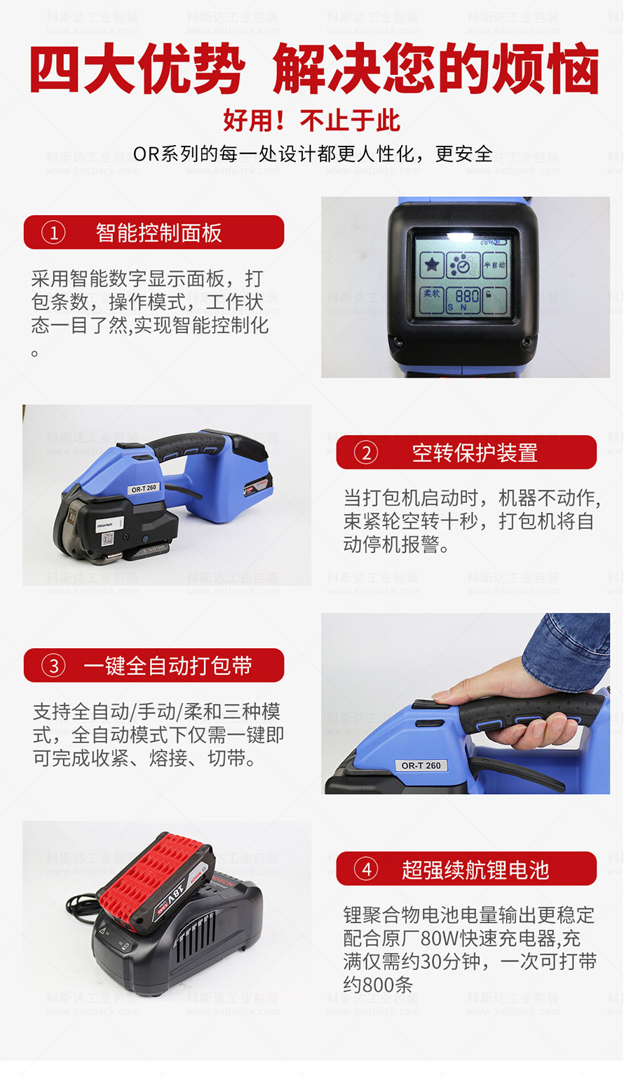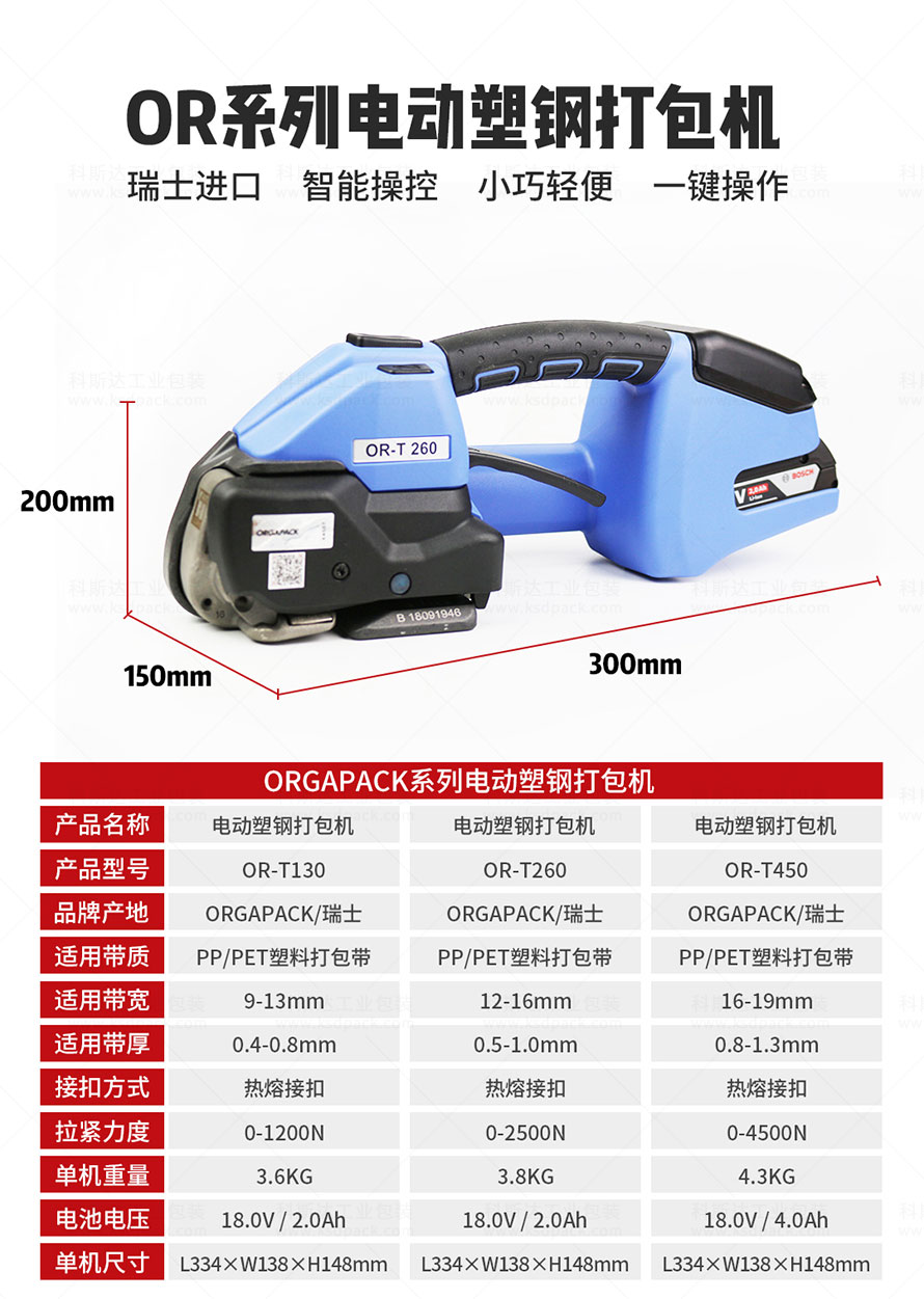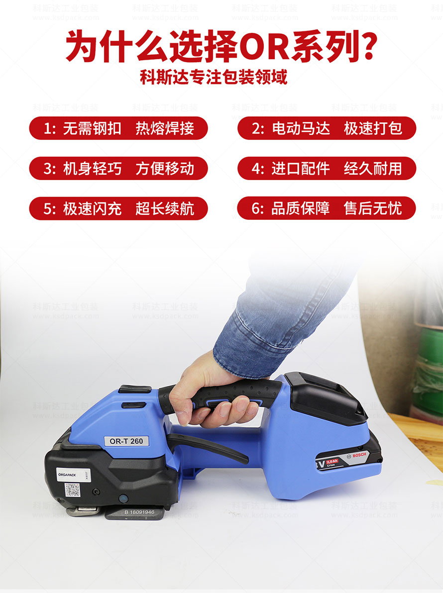 [產(chǎn)品介紹]OR-T260電動打包機是瑞士ORGAPACK打造的鋰電式打包機,便攜式設(shè)計不受打包場地限制實現(xiàn)自由打包,一鍵式操作只需10秒即可完成打包帶拉緊、熱熔接扣、切帶,輕松打包磚頭、鋁型材、光伏玻璃、陶瓷、衛(wèi)浴等產(chǎn)品。