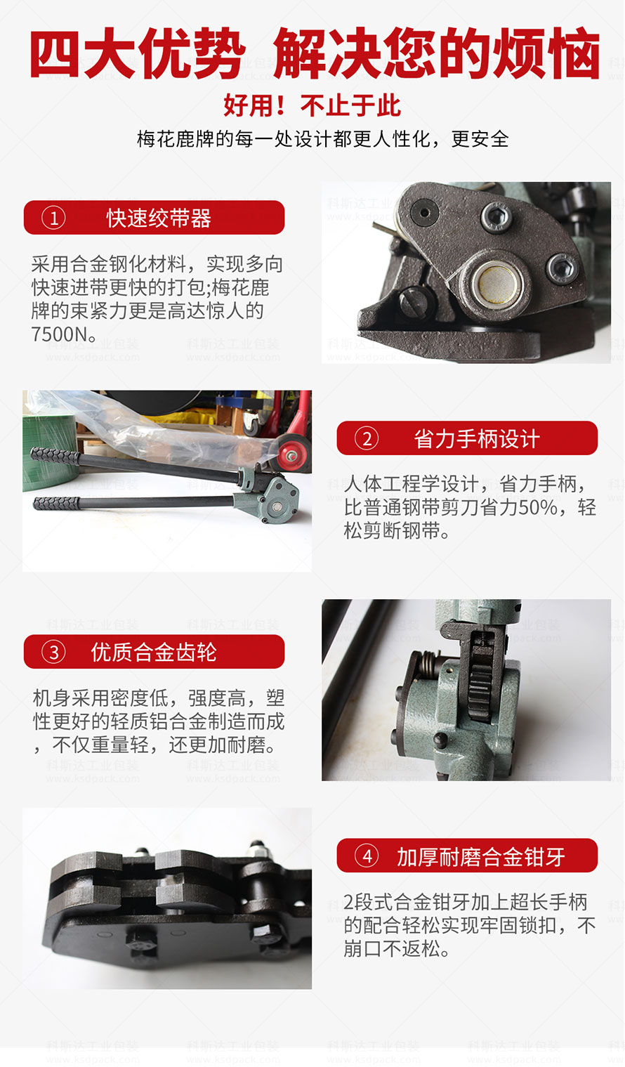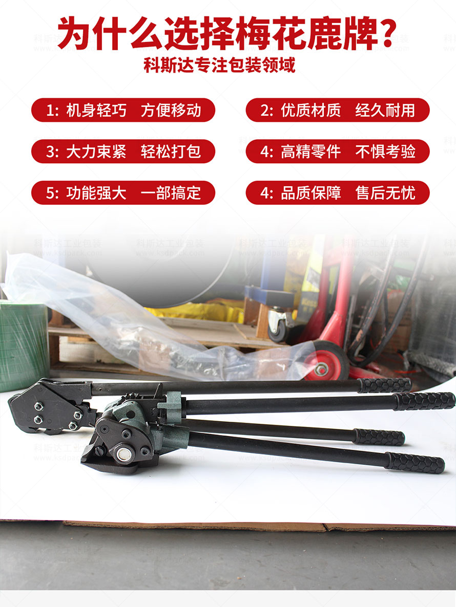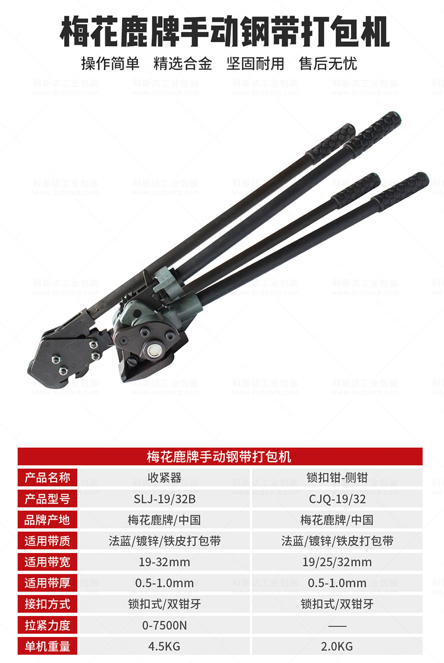[產(chǎn)品介紹]SLJ19/32B手動(dòng)鋼帶打包機(jī)是梅花鹿牌的捆扎工具,可以配套發(fā)藍(lán)鋼帶、鐵皮打包帶、鍍鋅鋼帶等捆扎包裝貨物,采用人工操作,故障率極低、機(jī)身輕巧、攜帶方便、適合惡劣工作環(huán)境作業(yè)。