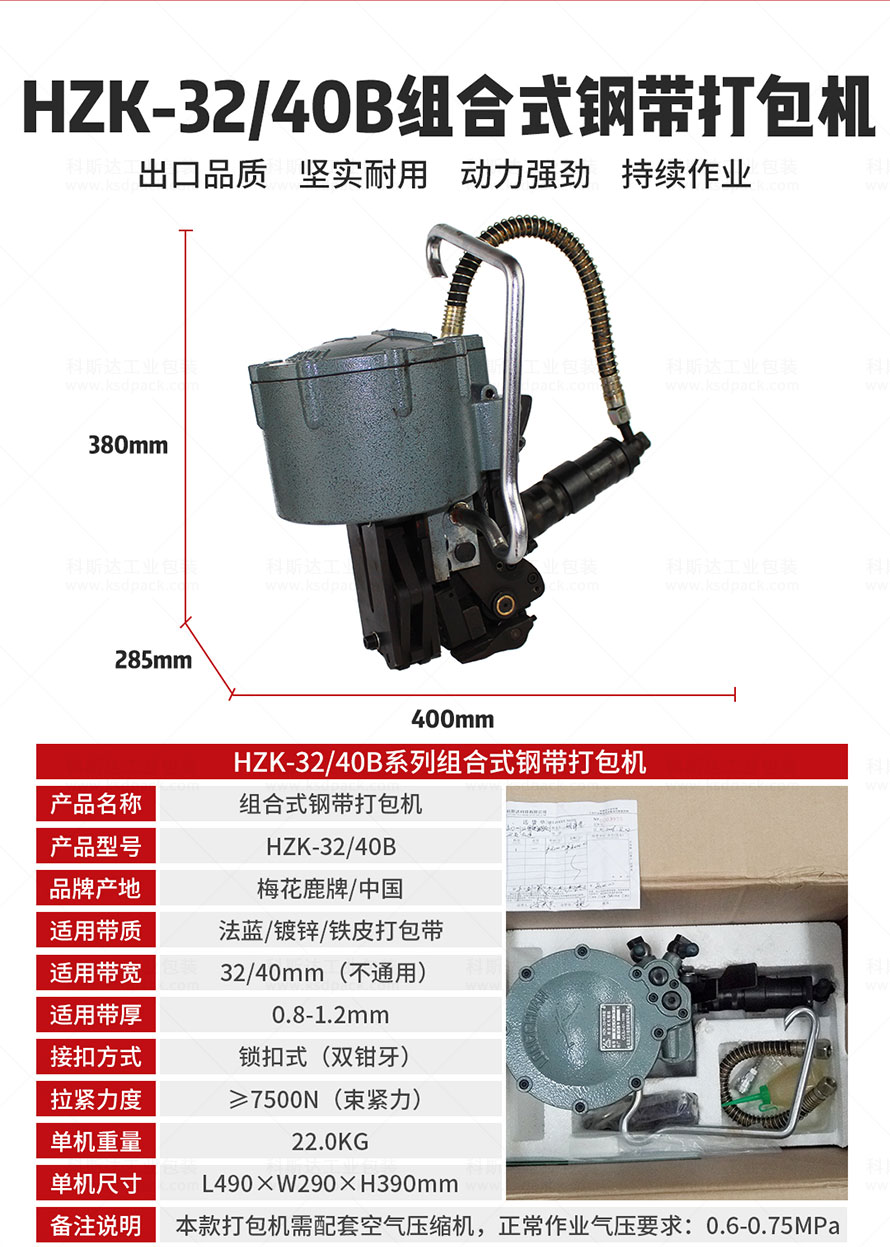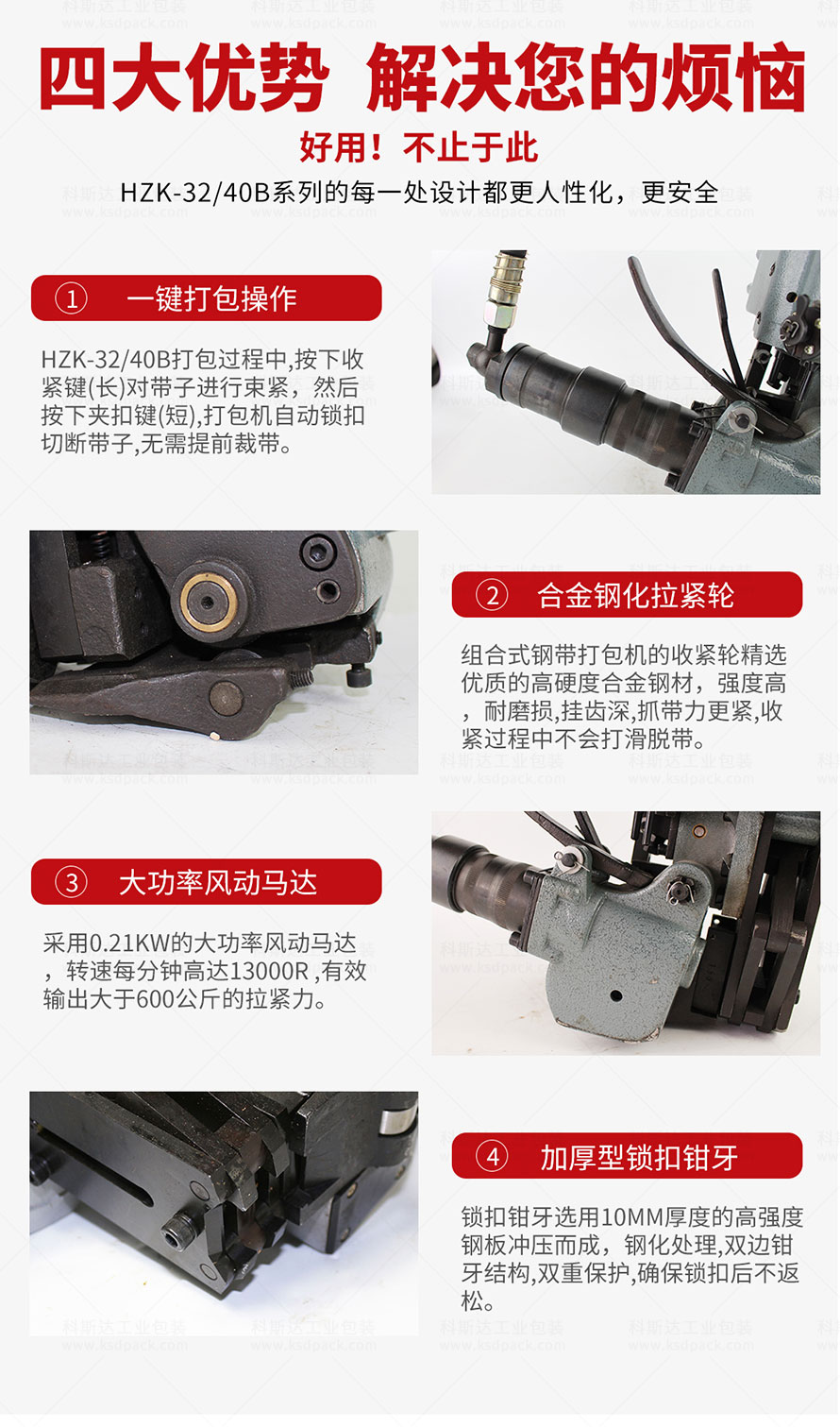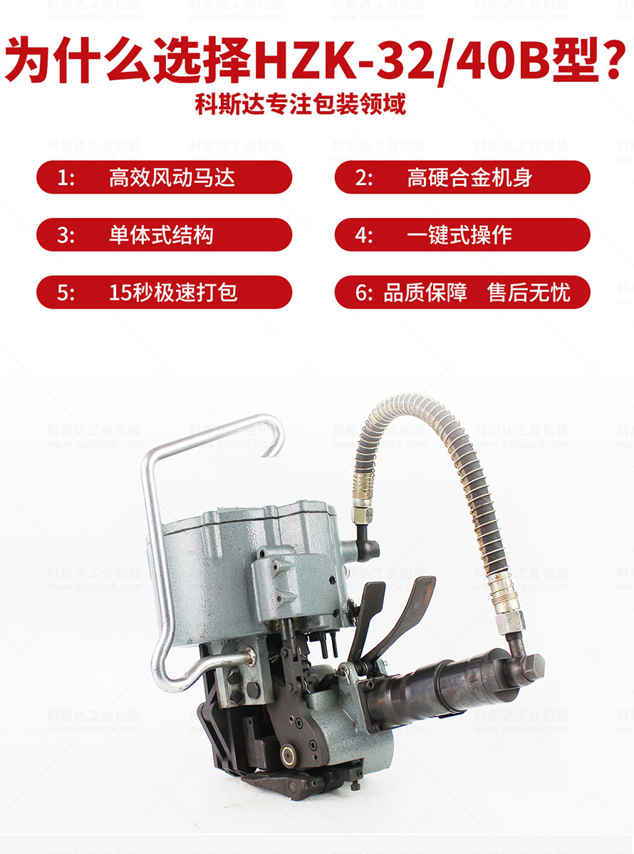 [產(chǎn)品介紹]HZK-32/40B組合式扎捆機(jī)是梅花鹿牌的氣動(dòng)鋼帶打包機(jī),配套32-40mm寬度,0.8-1.2mm厚度的鋼帶或鐵皮打包帶捆扎貨物。其特點(diǎn)是體積小、重量輕、結(jié)構(gòu)緊湊、打包效率高、適應(yīng)性強(qiáng)、使用方便、可靠,連續(xù)作業(yè)能力強(qiáng)。