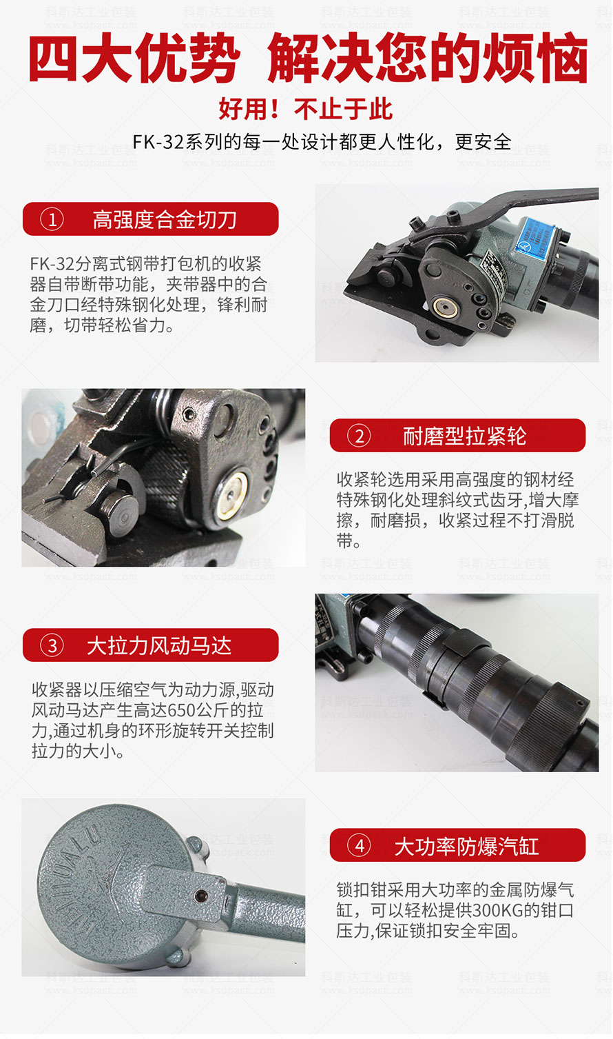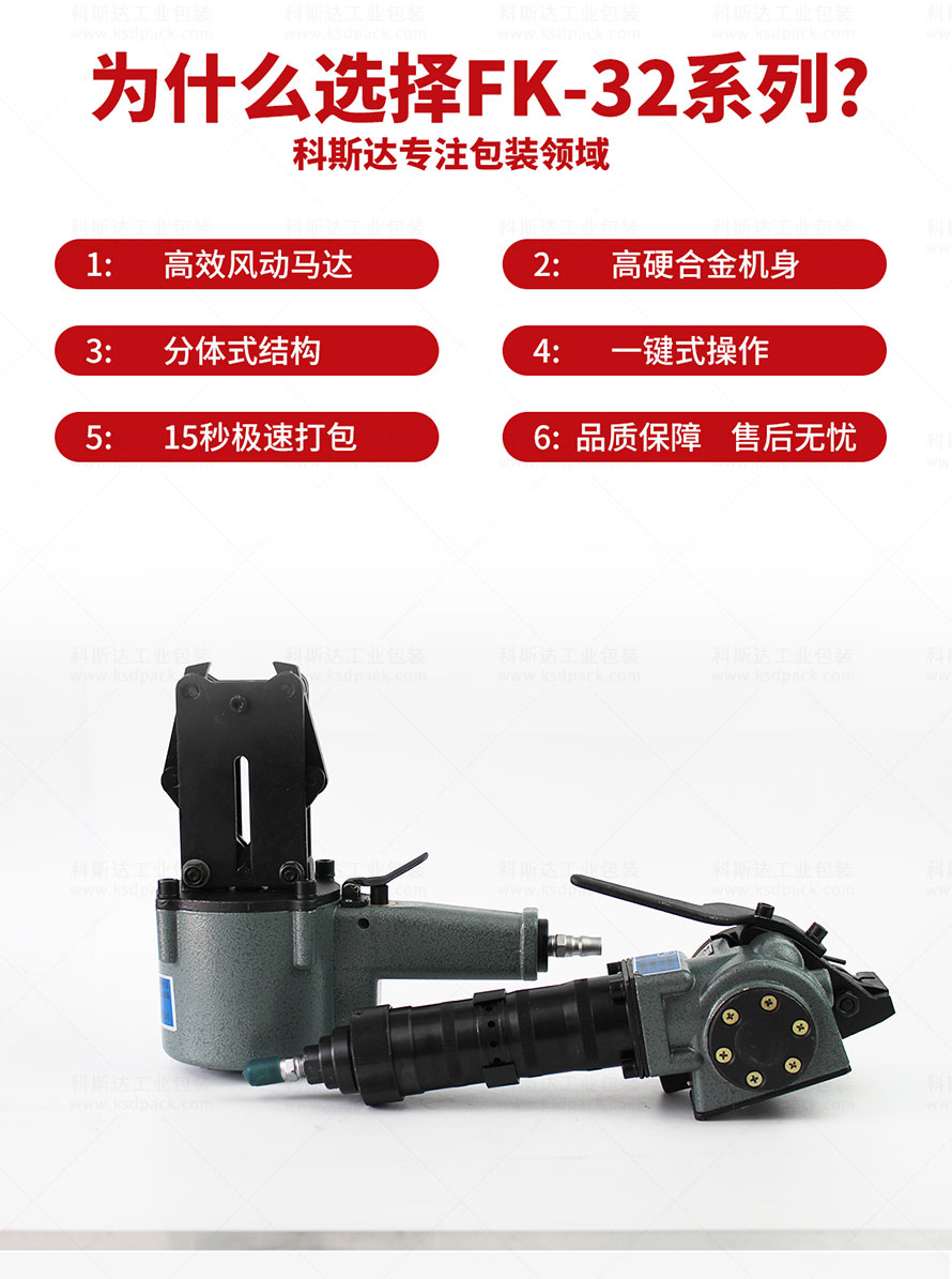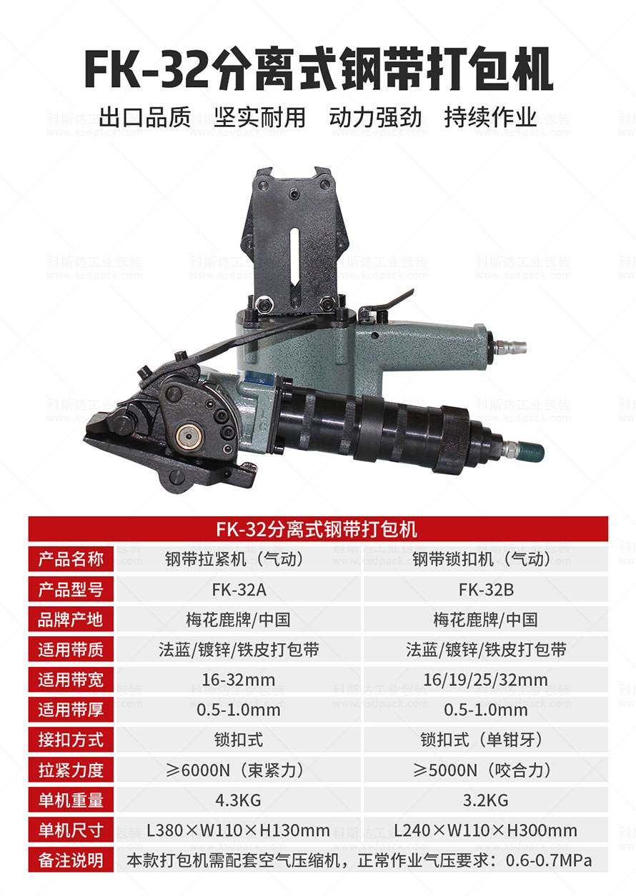 [產(chǎn)品介紹]FK-32B分離式鋼帶打包機(jī)是梅花鹿牌的大拉力型分體式打包機(jī),750公斤大拉力,配套1.2mm厚度的發(fā)藍(lán)鋼帶或鍍鋅鋼帶對貨物進(jìn)行捆扎包裝,氣源驅(qū)動,分體操作,便攜設(shè)計(jì),故障率低。