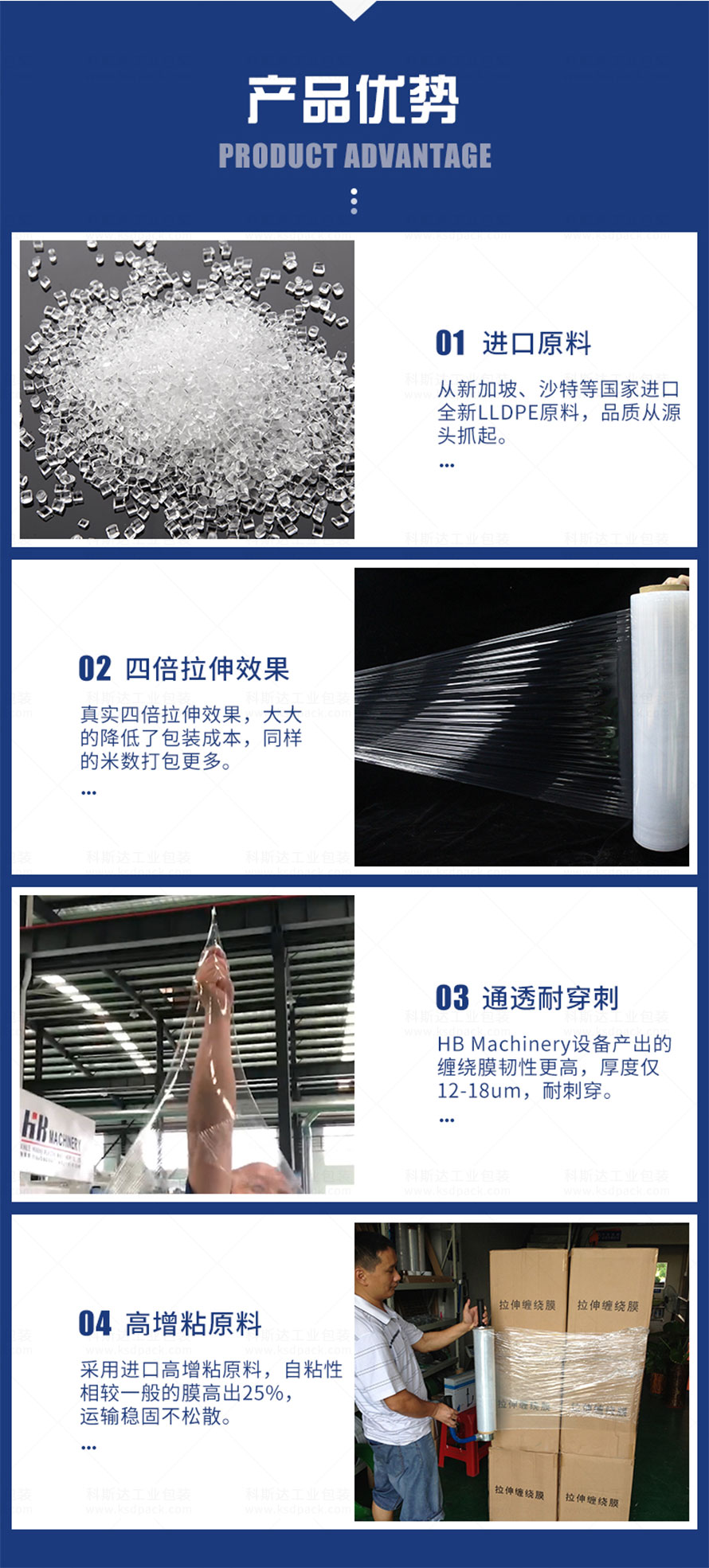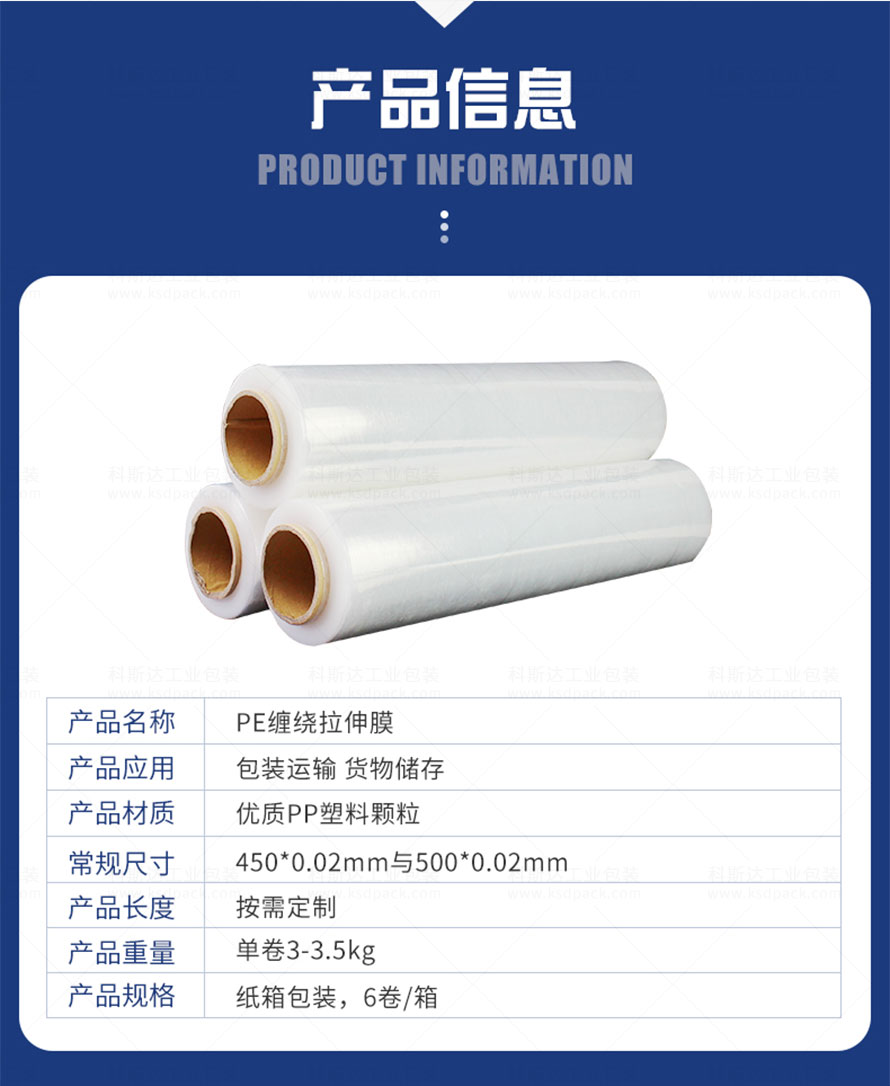 [產(chǎn)品介紹]科斯達(dá)工業(yè)包裝提供的手工、機(jī)用PE拉伸纏繞膜,打包膜具有150%延伸率和自粘性,可以配套手動拉膜器或全自動纏繞機(jī)裹包,防塵防水。