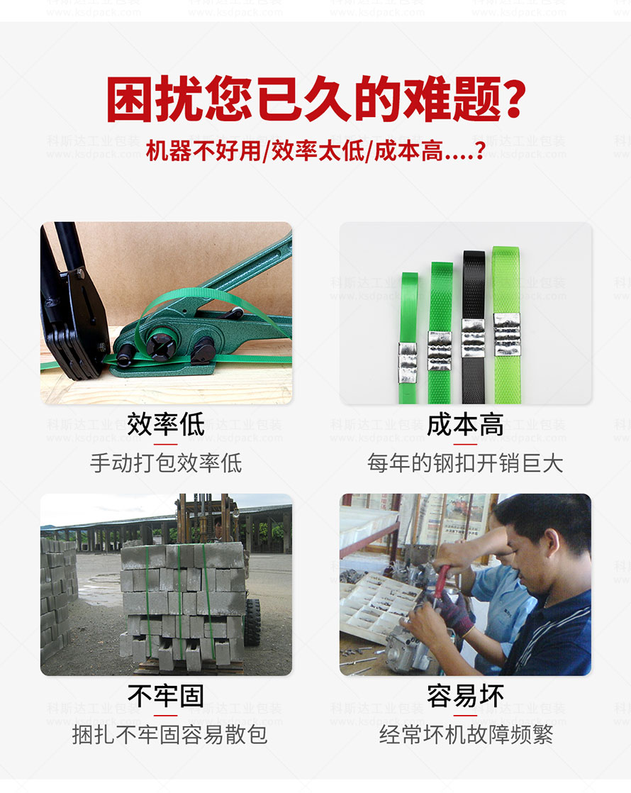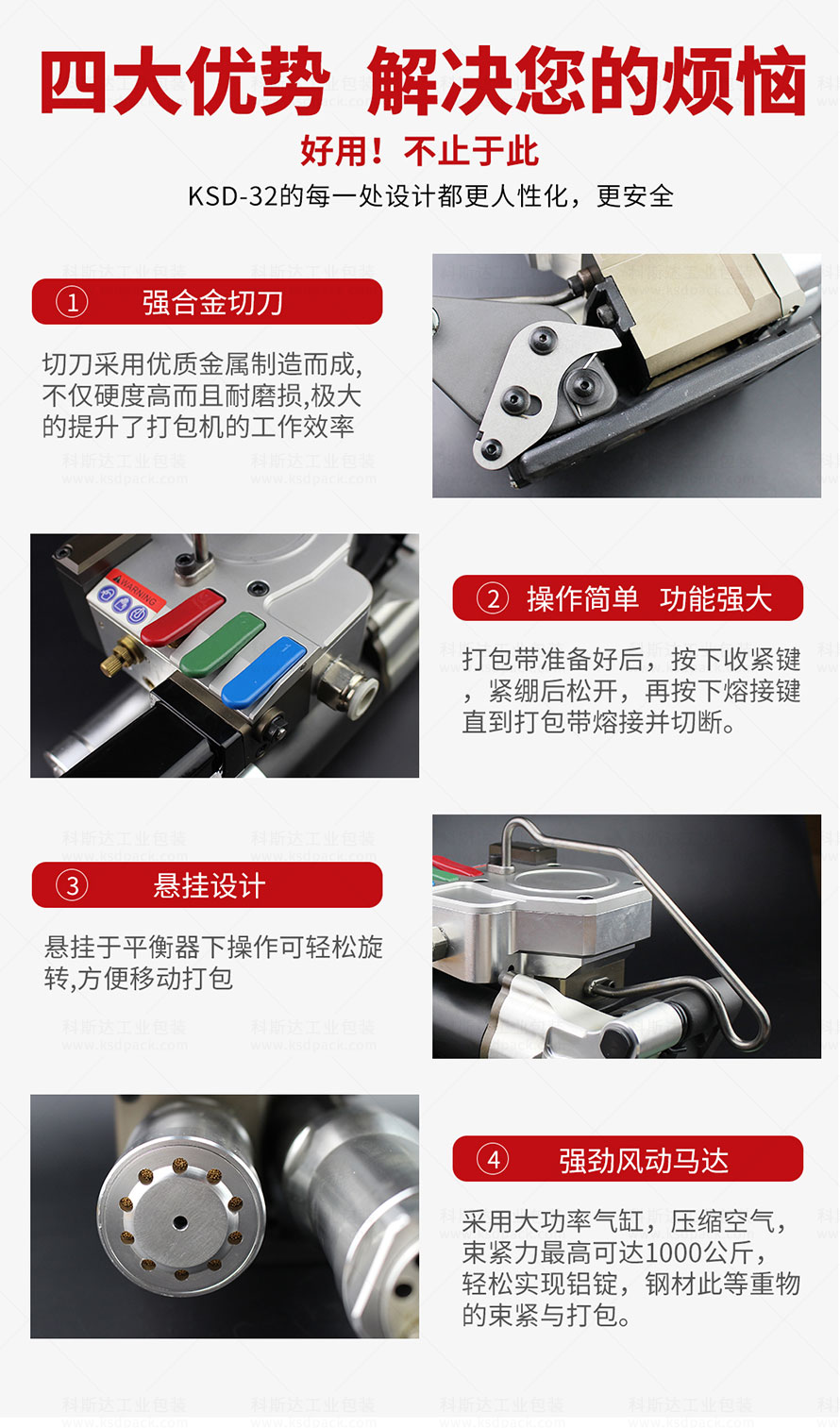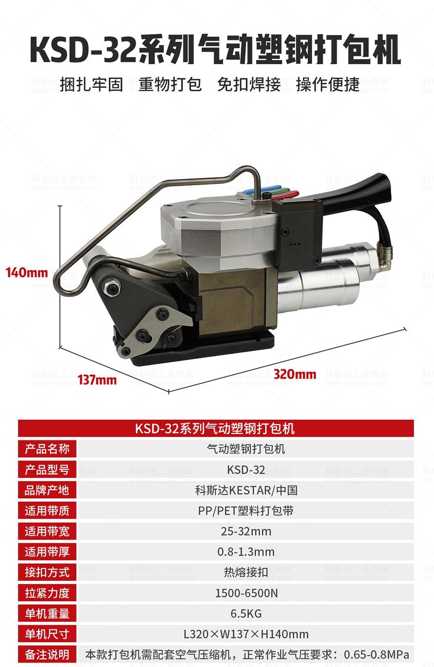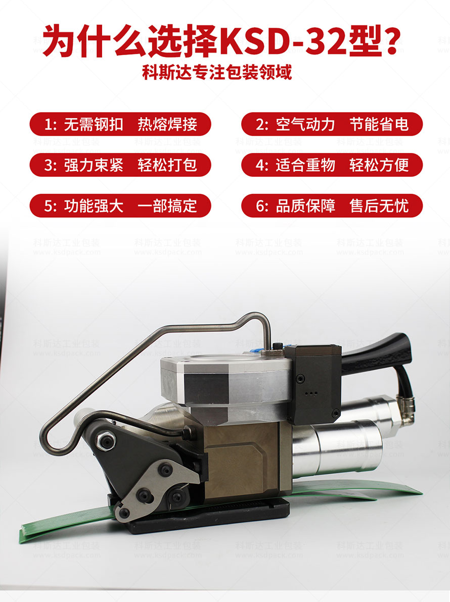 [產(chǎn)品介紹]KSD-32大拉力氣動(dòng)塑鋼帶打包機(jī)是科斯達(dá)工業(yè)包裝研發(fā)的配套25-32mm寬度PET塑鋼帶包裝貨物的熱熔捆扎機(jī),便攜式設(shè)計(jì),風(fēng)動(dòng)馬達(dá)驅(qū)動(dòng),一鍵式進(jìn)行拉緊、鎖扣和切帶操作,打包只需10秒。